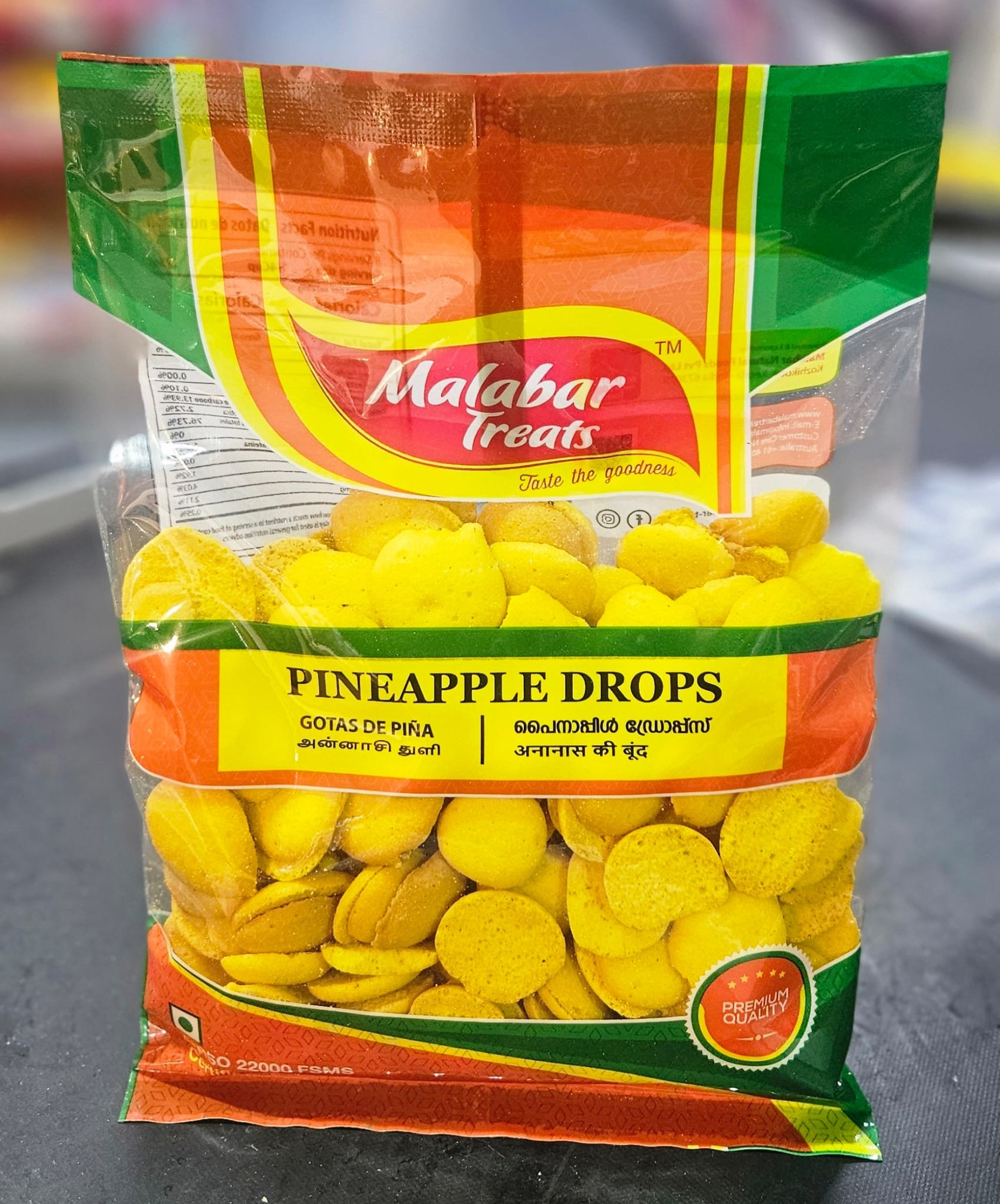 Malabar Treats Pineapple Drops are small, round, chewy snacks infused with a sweet pineapple flavor. They’re crafted from a flour-based dough that’s shaped into droplet-sized pieces and deep-fried to a satisfying chewiness and crisp edge .